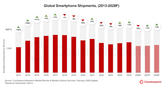 快科技2月28日消息,市场研究机构Counterpoint Research发布最新报告指出,受内存供应危机持续加剧影响,2026年全球智能手机出货量将迎来历史最严重跌幅,同比下滑12.4%至11亿部以下股票配资中心网址,创2013年以来的最低纪录。