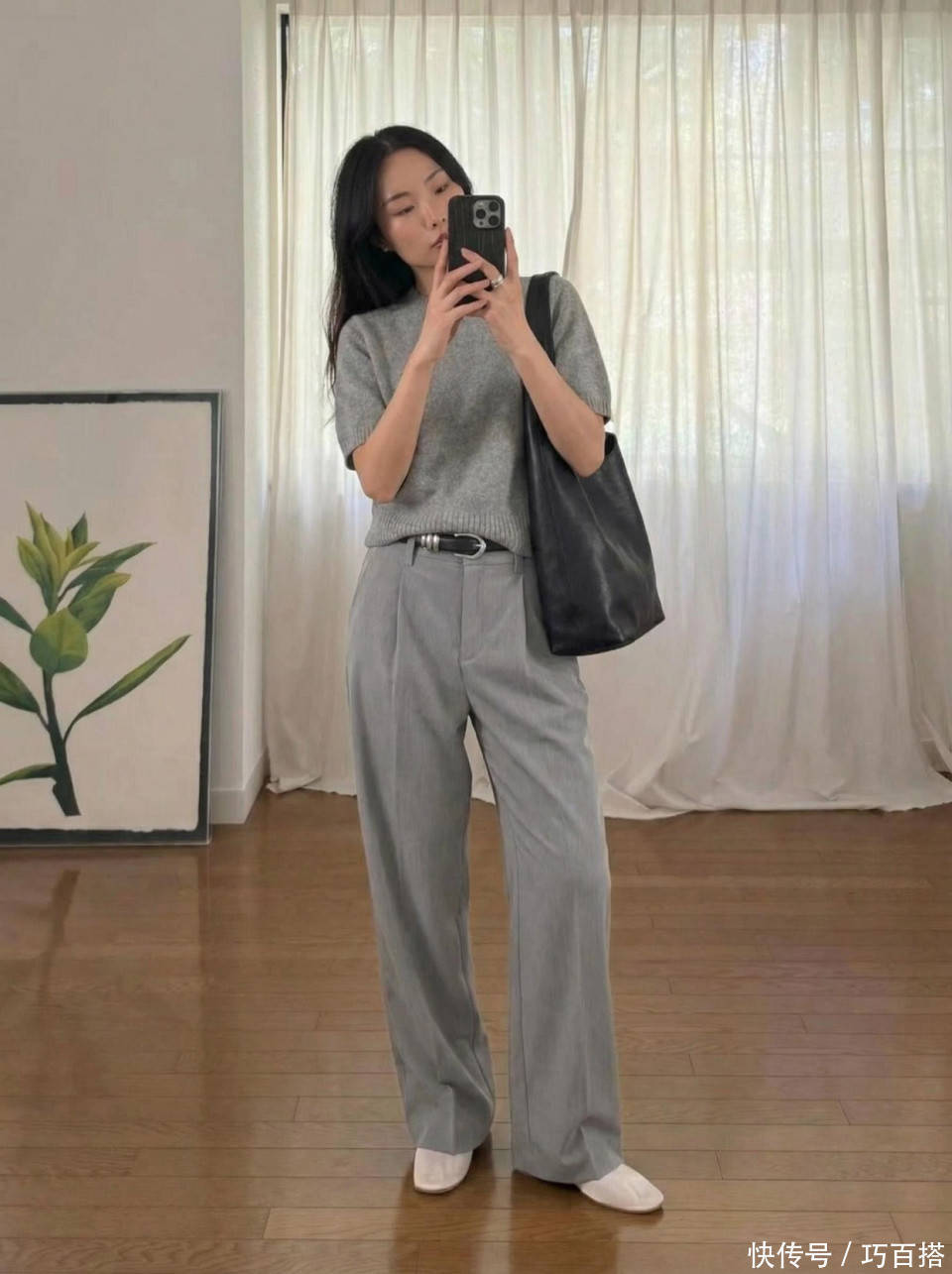 喜欢极简模式的姐妹,可以像博主一样选择同色系搭配,浅灰与深灰搭配,高级醒目,春天外穿出门美得与众不同。