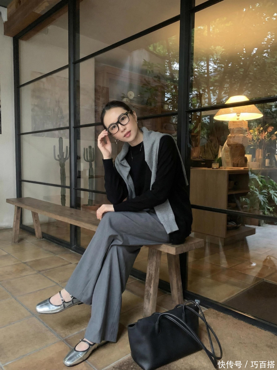 在整体搭配上,以黑灰色为主不会出错,银色玛丽珍鞋提亮整体色调,避免整体造型过于沉闷,精神利落,形象绝佳。