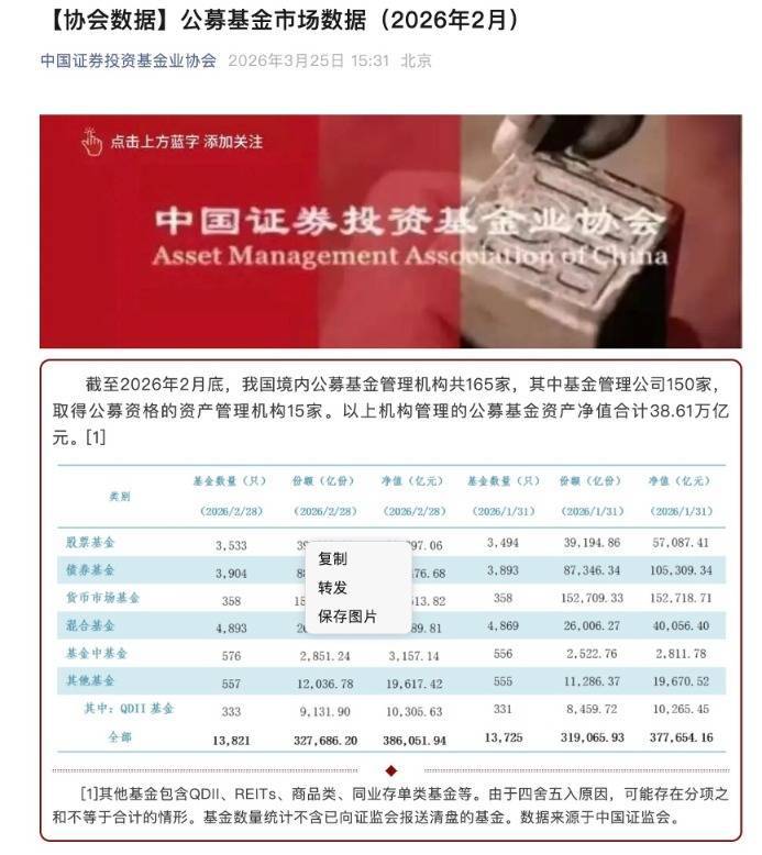 中基协最新发布的公募基金市场数据显示,截至2026年2月底,我国境内公募基金管理机构共165家,其中基金管理公司150家,取得公募资格的资产管理机构15家。