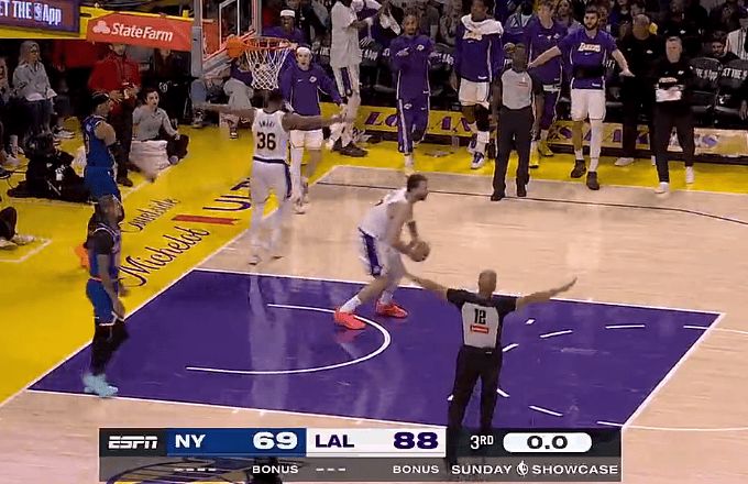虎扑03月09日讯 NBA常规赛,湖人主场迎战尼克斯的比赛正在进行中。